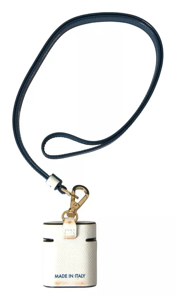 Dolce & Gabbana White Blue Calf Leather Logo Print Strap Airpods Case